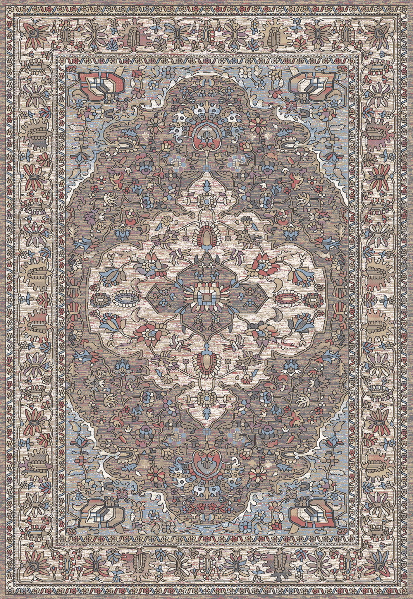Wzór dywanu utrzymany został w stylistyce orientalnych kobierców, które od wieków symbolizowały bogactwo i harmonię. Tło w odcieniu antracytu pięknie współgra z detalami w beżach, błękitach i subtelnych czerwieniach, tworząc kompozycję pełną głębi i wyrafinowanego uroku. Każdy detal misternie opracowanego wzoru sprawia wrażenie, jakby przenosił do dawnych pałacowych wnętrz, w których dywany odgrywały rolę nie tylko dekoracyjną, ale także symboliczną.
