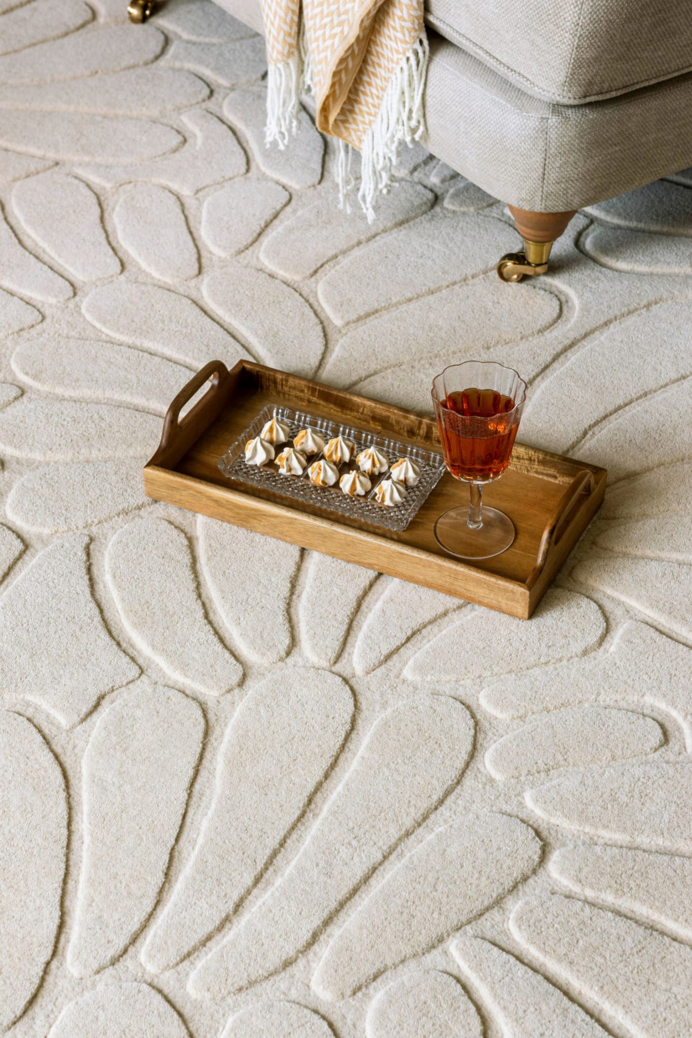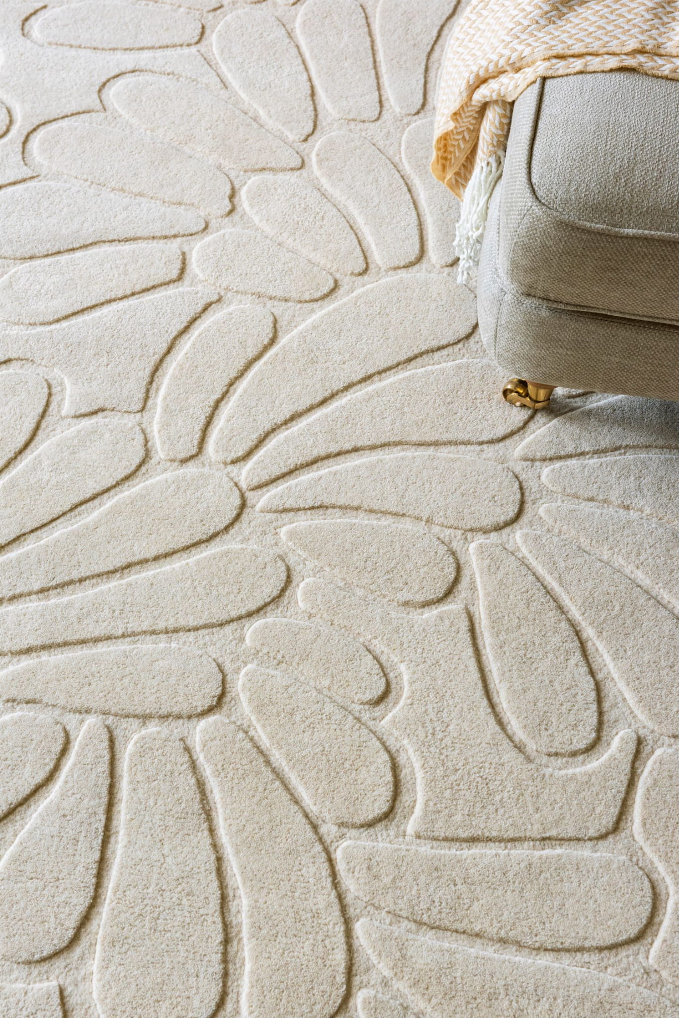 Utrzymany w odcieniu Ivory Cream, dywan emanuje ciepłem i lekkością. Jego miękka, kremowa tonacja sprawia, że doskonale rozświetla przestrzeń i optycznie ją powiększa, nadając pomieszczeniom przytulny, elegancki charakter. Subtelny, stylizowany wzór kwiatowych płatków został precyzyjnie wyrzeźbiony w strukturze runa, tworząc wyjątkowy efekt trójwymiarowości.