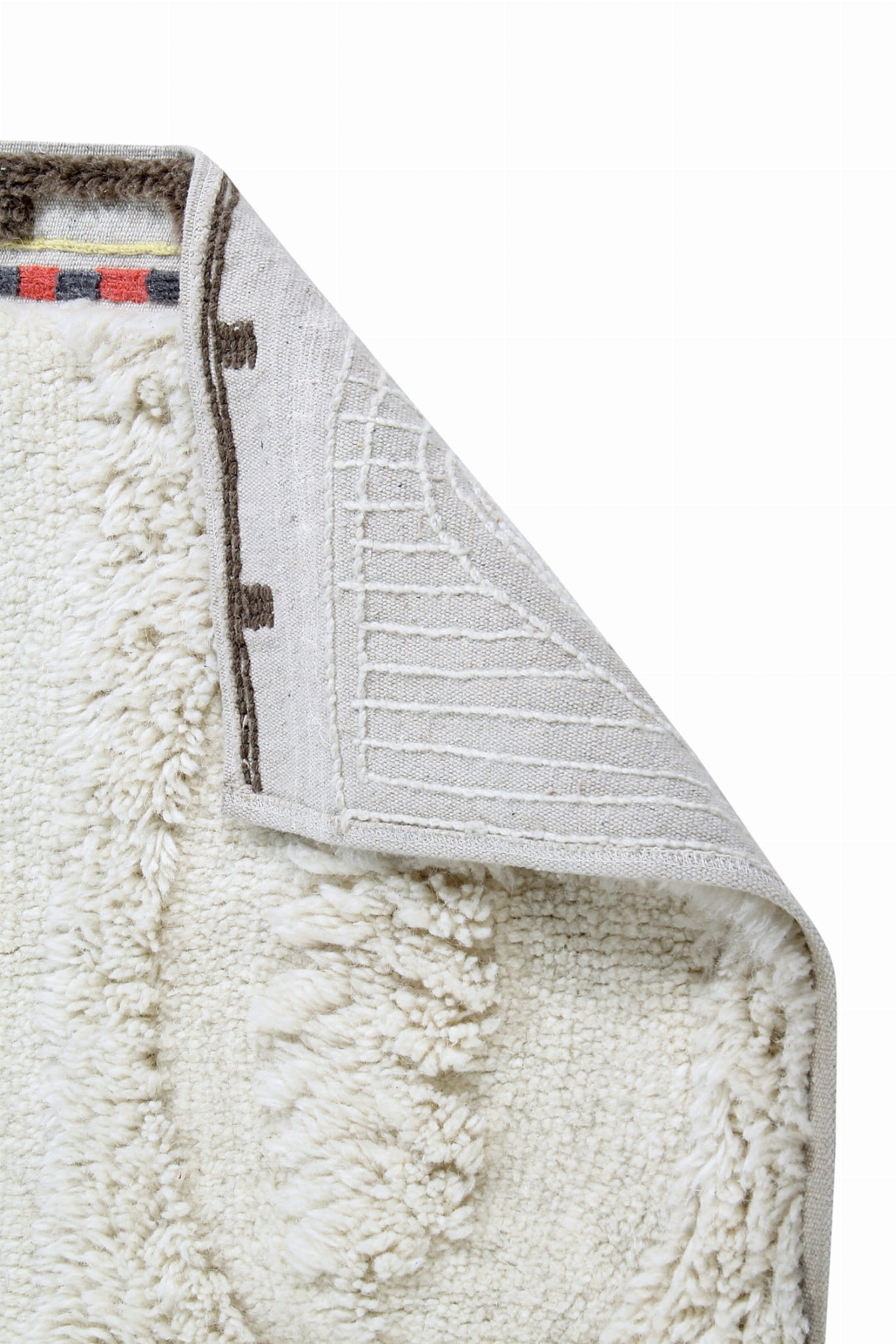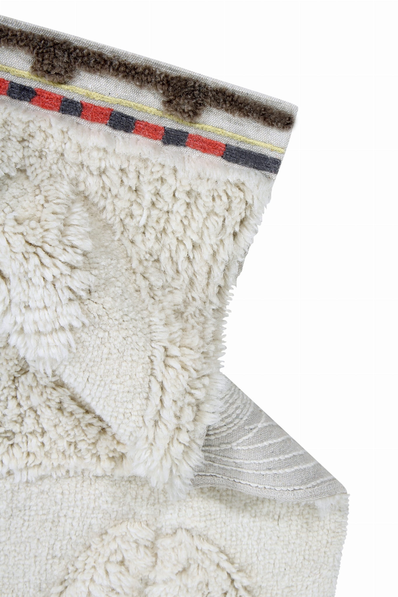 Jednym z wyróżniających się detali dywanu jest eleganckie wykończenie na jednej z krawędzi, gdzie widoczna płócienna podstawa została ozdobiona subtelnym haftem w harmonijnych odcieniach Charcoal, Sunlight i Arabesque. Całość dopełnia krótkie włosie w kolorze Almond Frost, nadając dywanowi wyjątkowy, ręcznie wykonany charakter.