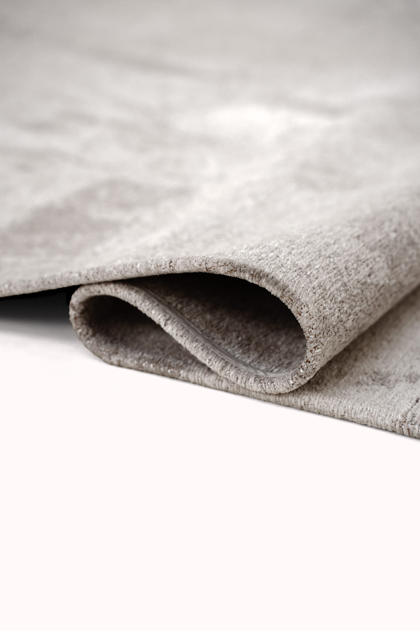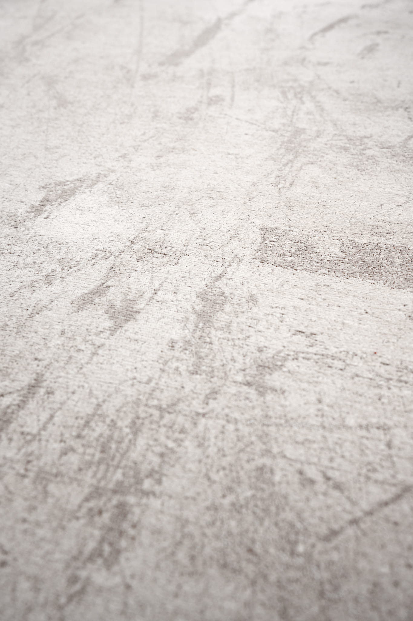 Jego stonowana, elegancka kolorystyka w odcieniach alabastru, szarości i delikatnego beżu przywodzi na myśl naturalne, surowe piękno powierzchni dotkniętej czasem. Struktura dywanu emanuje harmonią i spokojem, jednocześnie ukazując subtelne ślady zużycia, które nadają mu autentyczności i głębi. Żakardowy, płaski splot podkreśla złożoność wzoru, dodając mu wyjątkowej tekstury, która doskonale komponuje się zarówno z minimalistycznymi, jak i bardziej klasycznymi wnętrzami.