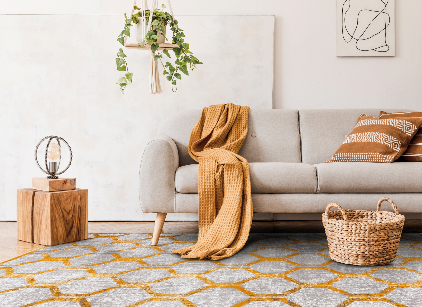 Dywan FD Soft TEHYA Złoty to kwintesencja współczesnego designu, gdzie geometryczne wzory spotykają się z subtelną, stonowaną paletą barw. Produkowany z najwyższą starannością w Polsce, ten dywan łączy w sobie nowoczesną estetykę z funkcjonalnością, doskonale wpisując się w potrzeby dzisiejszych wnętrz.