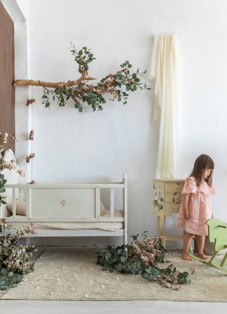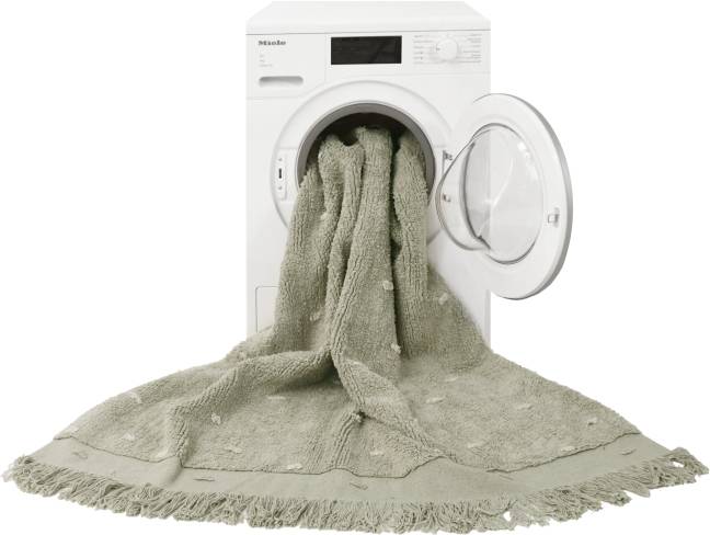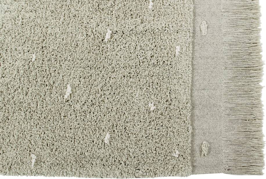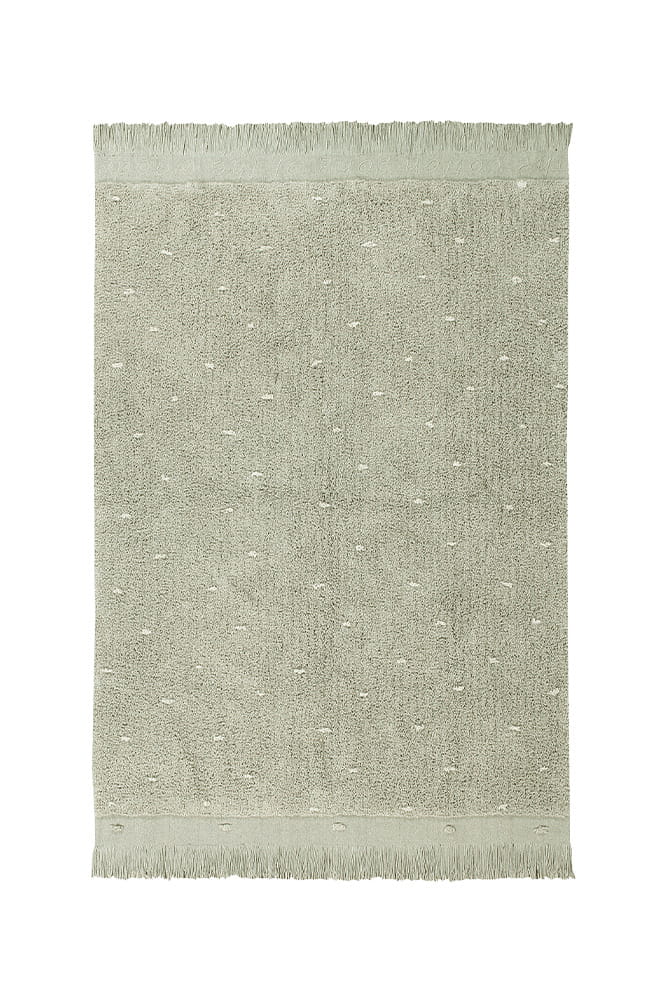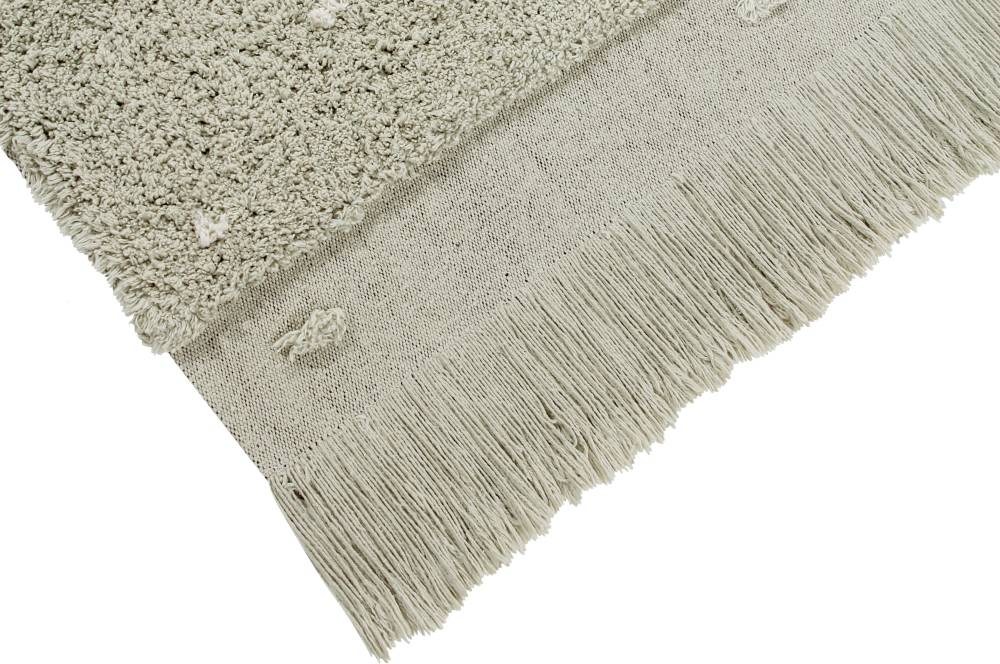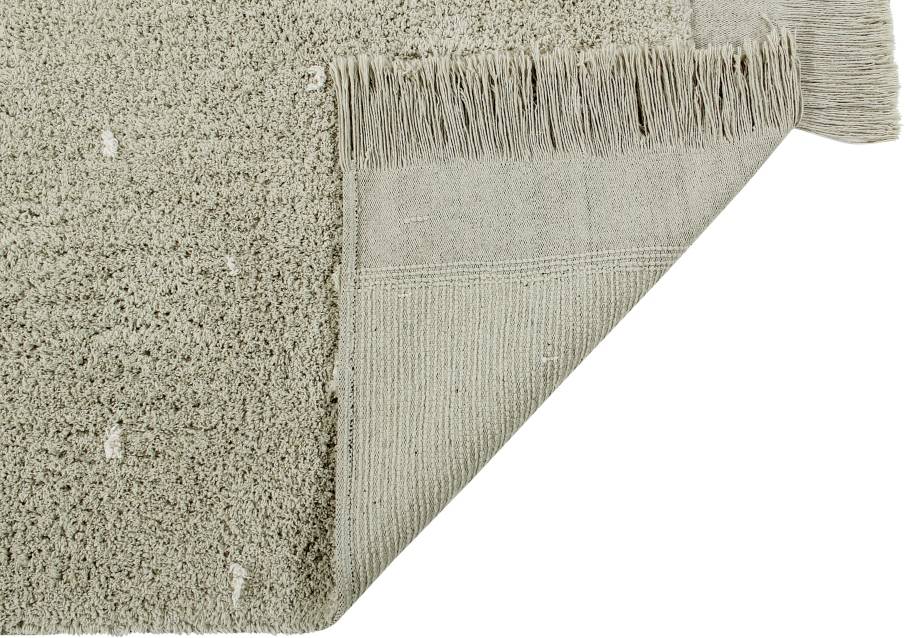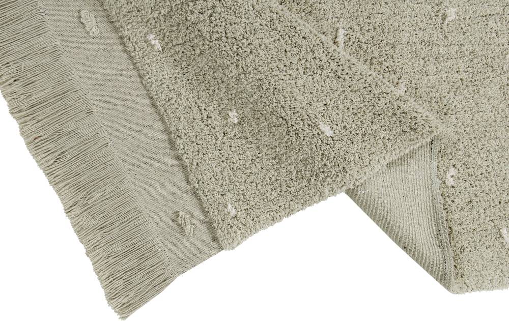 Prostokątny dywanik wykonany jest z bawełny, z małymi kropkami, imitującymi trawę na bawełnianej podstawie w odcieniu Olive. Płócienna podstawa, widoczna na krawędziach dywanu, dodaje mu naturalności i lekkości, a frędzle w tym samym kolorze na zakończeniu dywanu są pięknym, dekoracyjnym akcentem.